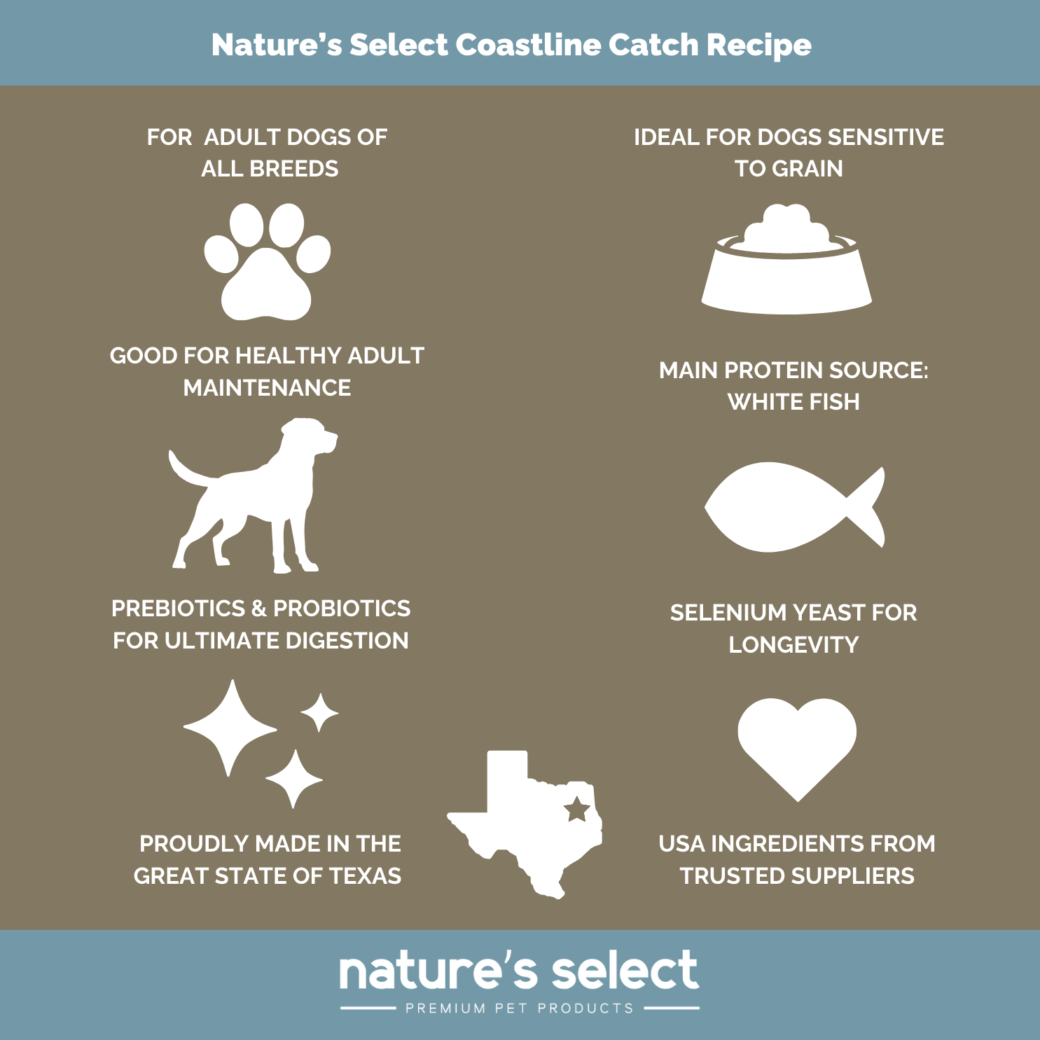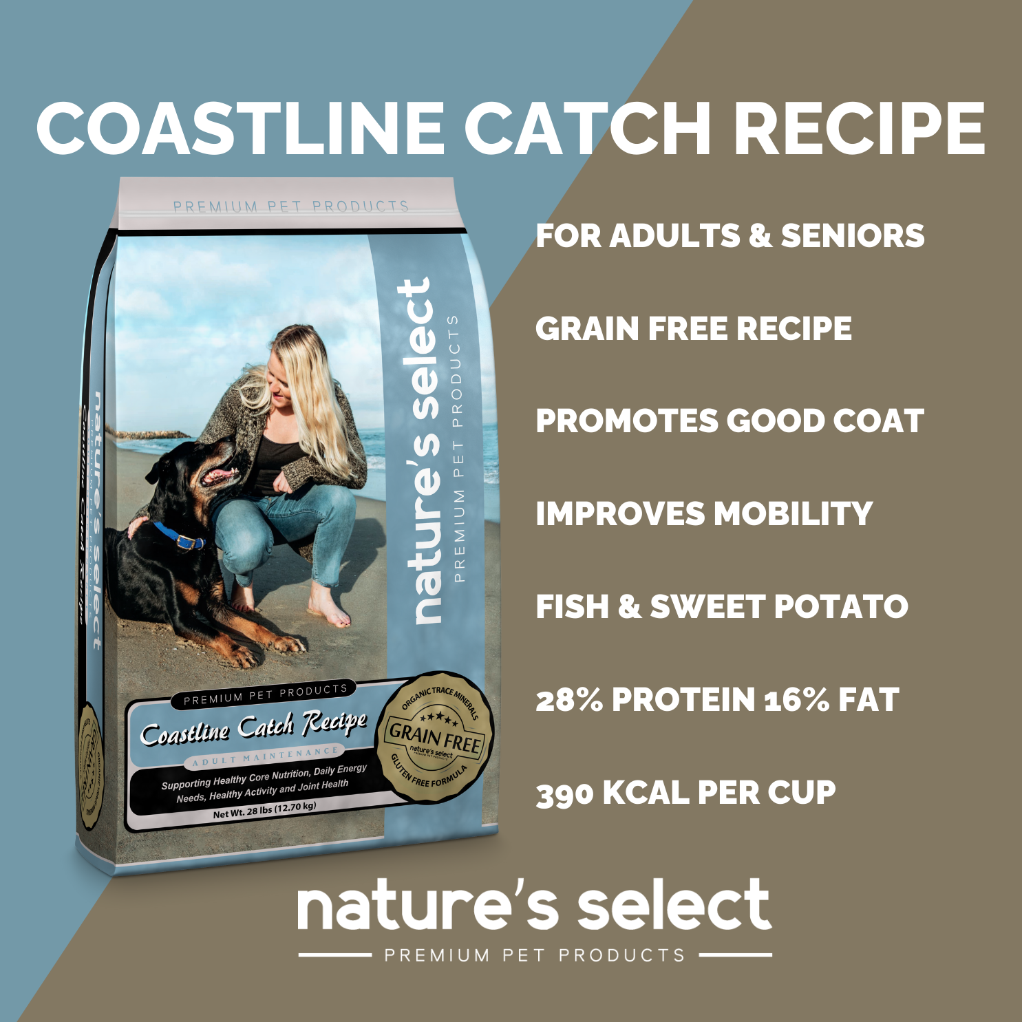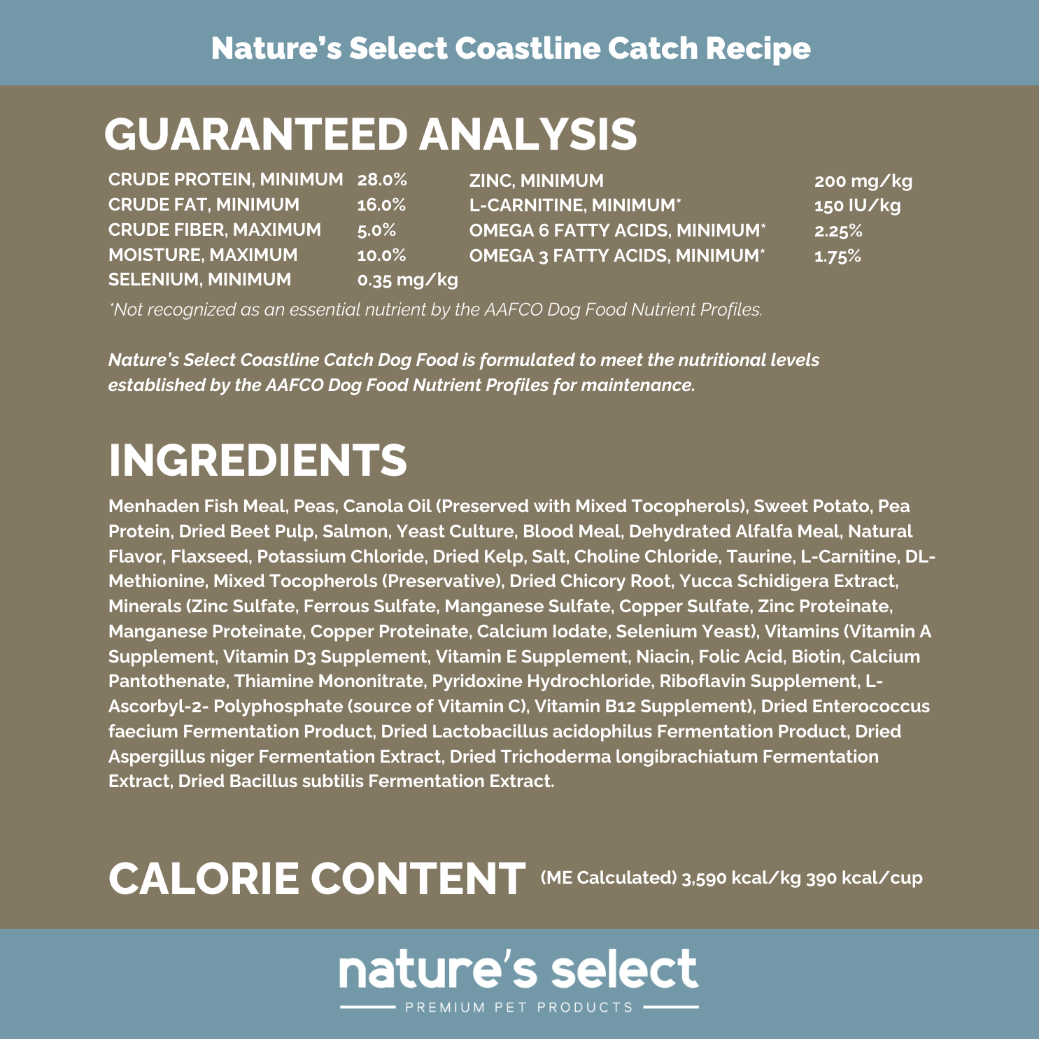 Nature's Select Grain Free Coastline Catch Recipe is formulated to meet the nutritional levels established by the AAFCO Dog Food Nutrient Profiles for maintenance.