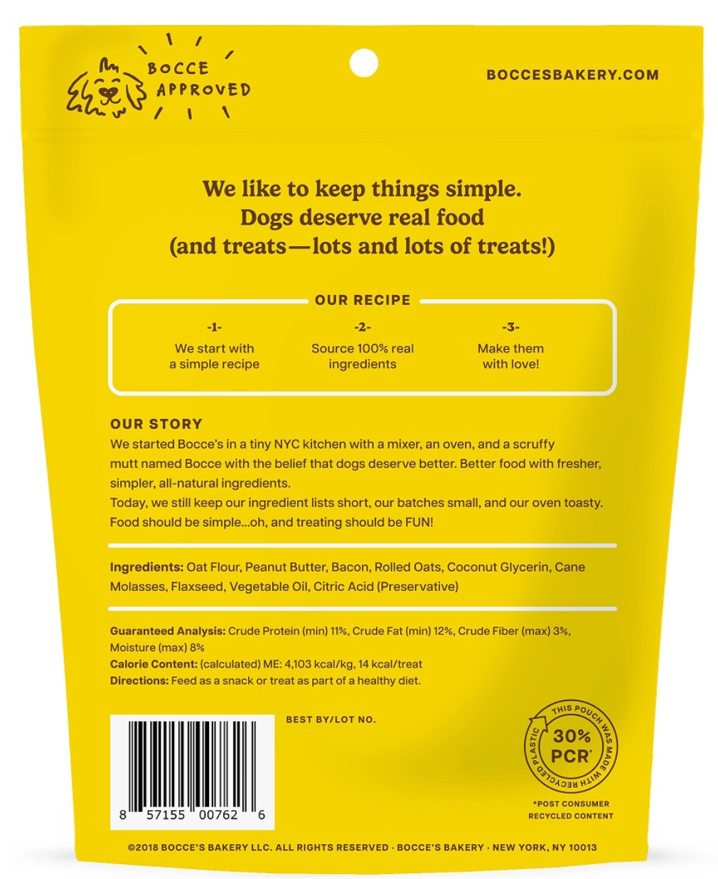 Ingredients: Oat Flour, Peanut Butter, Bacon, Rolled Oats, Coconut Glycerin, Molasses, Flaxseed, Vegetable Oil, Citric Acid
